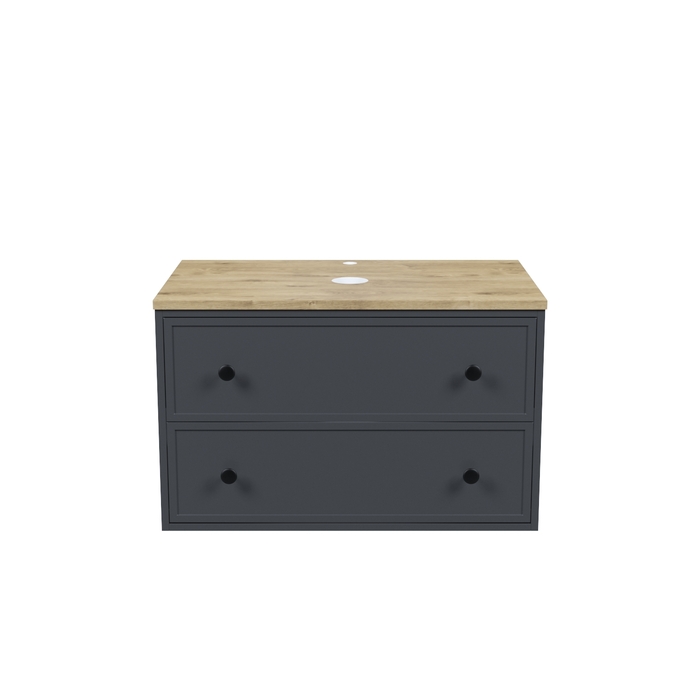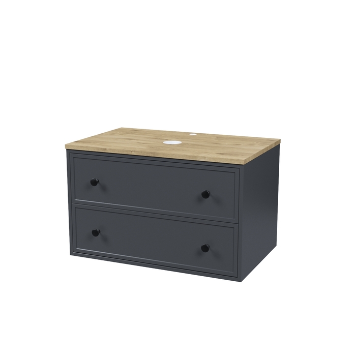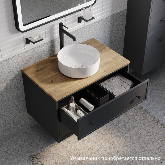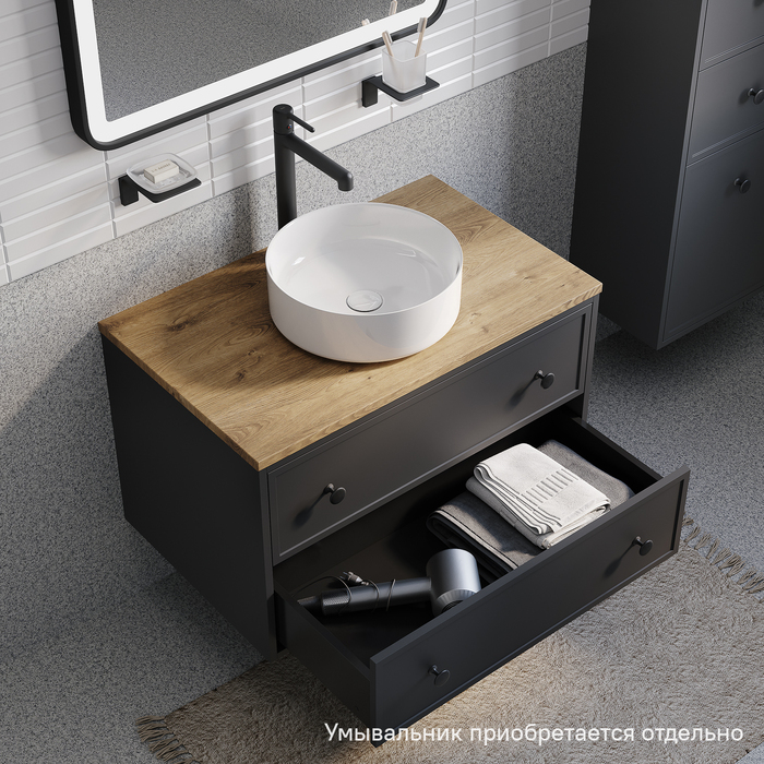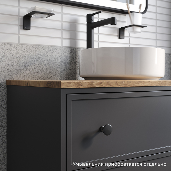 Вместительная подвесная тумба Torr трендового темно-серого цвета со столешницей из МДФ в оттенке дуба верона. Сочетает в себе узнаваемый стиль и практичность популярного скандинавского дизайна. Ее четкие формы, теплый цвет дерева, фасады с декоративной филенкой, круглые ручки смотрятся гармонично и впишутся в любой современный интерьер. Подойдет любой накладной умывальник, покупается отдельно. • Два просторных выдвижных ящика закрываются плавно и бесшумно благодаря высококачественным скрытым направляющим с доводчиками Hettich. Внутри ящики графитового цвета – стильно и практично. • Покрытие качественной влагостойкой пленкой, разработанной для использования в помещениях с высокой влажностью, сохранит первоначальный вид мебели надолго (при должном уходе). • Надежная фурнитура Hettich рассчитана на 30 000 открываний – это более 10 лет исправной работы. Гарантия на мебель IDDIS® – 3 года. (с) Авторский текст, декабрь 2023 г.