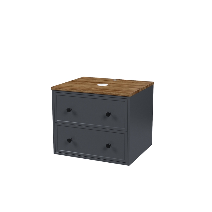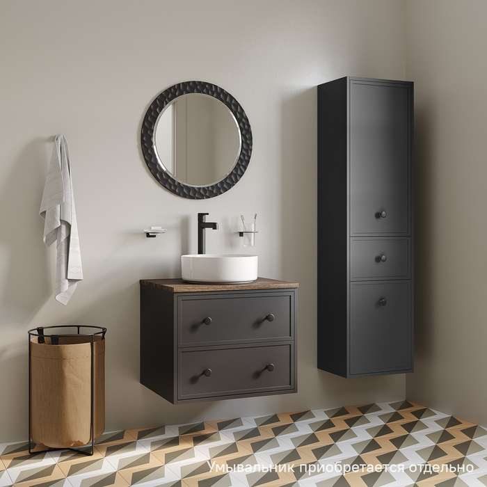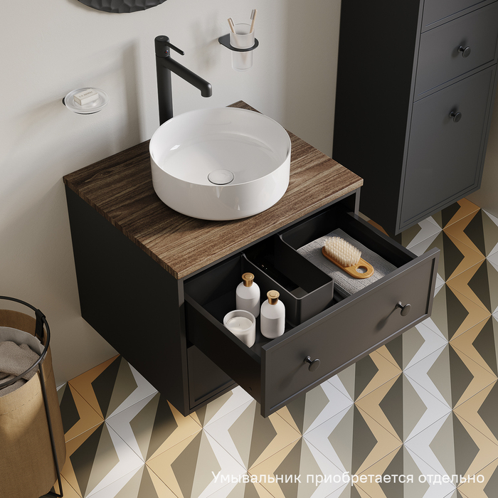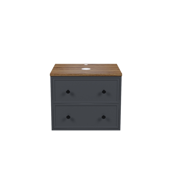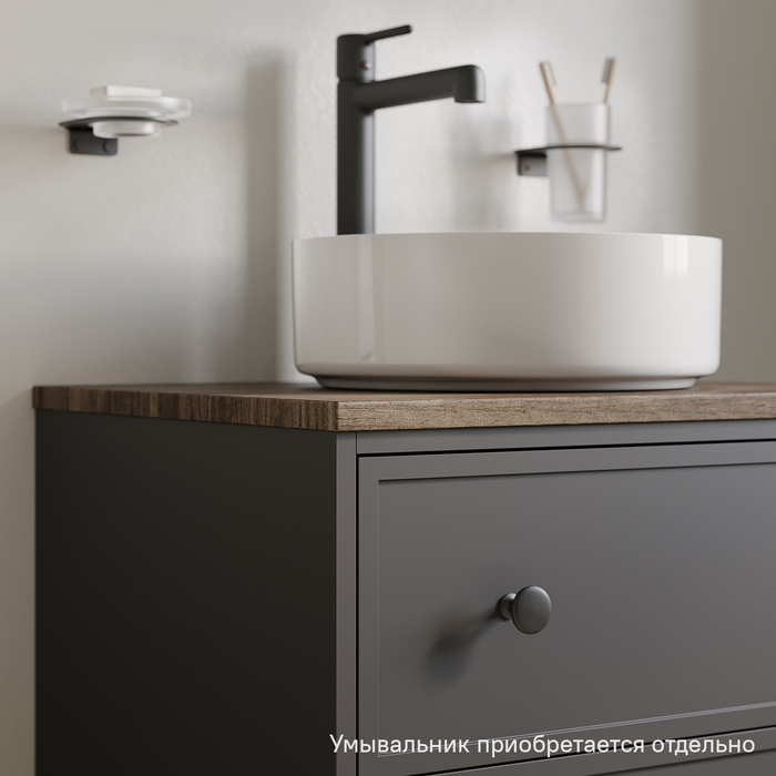 Компактная подвесная тумба Torr трендового темно-серого цвета со столешницей из МДФ в оттенке ореха макадамия. Сочетает в себе узнаваемый стиль и практичность популярного скандинавского дизайна. Ее четкие формы, теплый цвет дерева, фасады с декоративной филенкой, круглые ручки смотрятся гармонично и впишутся в любой современный интерьер. Подойдет любой накладной умывальник, покупается отдельно. • Два просторных выдвижных ящика закрываются плавно и бесшумно благодаря высококачественным скрытым направляющим с доводчиками Hettich. Внутри ящики графитового цвета – стильно и практично. • Покрытие качественной влагостойкой пленкой, разработанной для использования в помещениях с высокой влажностью, сохранит первоначальный вид мебели надолго (при должном уходе). • Надежная фурнитура Hettich рассчитана на 30 000 открываний – это более 10 лет исправной работы. Гарантия на мебель IDDIS® – 3 года. (с) Авторский текст, декабрь 2023 г.