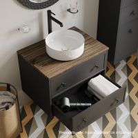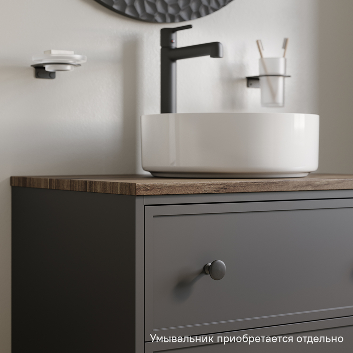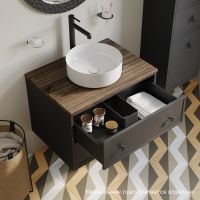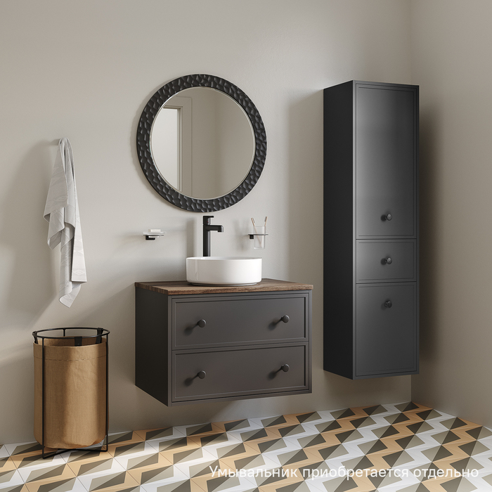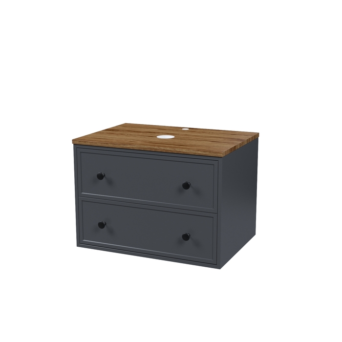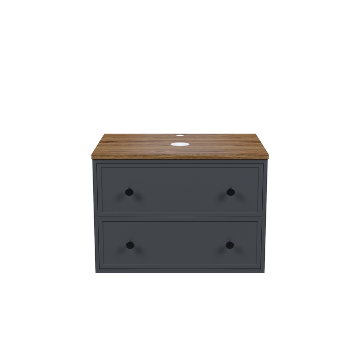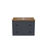 Компактная подвесная тумба Torr трендового темно-серого цвета со столешницей из МДФ в оттенке ореха макадамия. Сочетает в себе узнаваемый стиль и практичность популярного скандинавского дизайна. Ее четкие формы, теплый цвет дерева, фасады с декоративной филенкой, круглые ручки смотрятся гармонично и впишутся в любой современный интерьер. Подойдет любой накладной умывальник, покупается отдельно. • Два просторных выдвижных ящика закрываются плавно и бесшумно благодаря высококачественным скрытым направляющим с доводчиками Hettich. Внутри ящики графитового цвета – стильно и практично. • Покрытие качественной влагостойкой пленкой, разработанной для использования в помещениях с высокой влажностью, сохранит первоначальный вид мебели надолго (при должном уходе). • Надежная фурнитура Hettich рассчитана на 30 000 открываний – это более 10 лет исправной работы. Гарантия на мебель IDDIS® – 3 года. (с) Авторский текст, декабрь 2023 г.