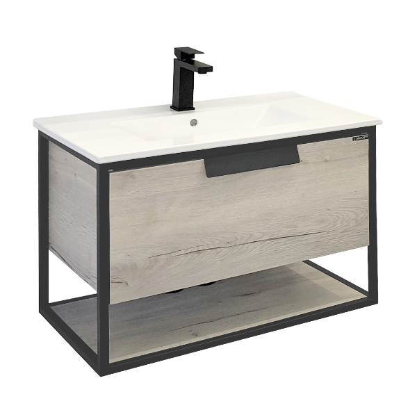 Подвесная тумба-умывальник с одним выкатным ящиком оснащенным системой плавного закрывания и нижней полкой открытого хранения. В основе тумбы - каркас из стального профиля окрашенный эмалью цвета графит серый. Керамическая раковина Quadro 90 из санфарфора. Название: Тумба-умывальник Артикул: 00-00011781CF Цвет корпуса и фасада: Дуб дымчатый Материал корпуса: влагостойкое ЛДСП Цвет каркаса: графит серый Материал каркаса: сталь Габариты (ШхВхГ): 910*520*465 мм Комплектация: накладная раковина Sanita Luxe Quadro 90. Тумба подготовлена для подключения водоснабжения снизу. Инструкция для мебели для ванных комнат COMFORTY Схема монтажа и подключения коммуникаций
