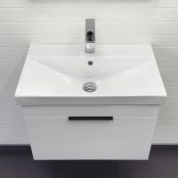Название: Тумба-умывальник Артикул: 00-00018655CF Варианты цвета корпуса и фасадов: белый глянец Материал корпуса и фасада: МДФ Габариты (ШхВхГ): 610*460*395 мм Комплектация: керамическая раковина Comforty CF19696BX-60 Подвесная тумба с одним большим выдвижным ящиком оборудованным системой плавного закрывания. Фасад изготовлен из МДФ и окрашены белой глянцевой эмалью. Внутренние детали тумбы выполнены из влагостойкого ЛДСП цвета графит. Металлическая профильная ручка черного цвета. Тумба подготовлена для подключения водоснабжения сзади и снизу. Инструкция для мебели для ванных комнат COMFORTY Схема монтажа и подключения коммуникаций