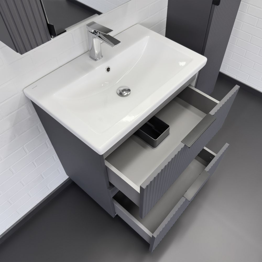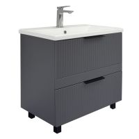 Название: Тумба-умывальник Артикул: 00-00019179CF Варианты цвета корпуса: Антрацит Материал корпуса: ВЛДСП Цвет фасада: Антриацит Материал фасада: МДФ Габариты (ШхВхГ): 700*850*450 мм Комплектация: керамическая раковина Como 70 Напольная тумба-умывальник с двумя выкатными ящиками декорированными вертикальной фрезеровкой. Ящики оснащены направляющими с механизмами плавного закрывания. В модели применяется плёнка цвета антрацит с эффектом Soft-Touch. Тумба подготовлена для подключения коммуникаций снизу и сзади. Инструкция для мебели для ванных комнат COMFORTY Схема монтажа и подключения коммуникаций