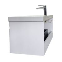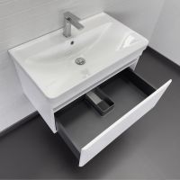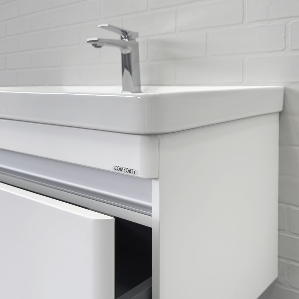 Название: Тумба-умывальник Коллекция: Валдай Артикул: 00-00019144CF Цвет: белый матовый Габариты ШхВхГ: 810х460х475 мм Корпус и фасад тумбы из МДФ окрашен белой матовой эмалью. Комплектация: керамическая раковина с прямоугольной чашей Comforty 4480. Подвесная тумба с одним большим выдвижным ящиком. Направляющие ящика оборудованы системой плавного закрывания. Лицевая фурнитура на фасаде отсутствует, для открытия ящика нужно потянуть верхний край фасада, на котором сделан вырез под естественный хват. Прорезь в фасаде декорирована алюминиевым профилем. Ящик выполнен из ВЛДСП контрастного цвета серый уголь. Тумба подготовлена для подключению коммуникаций снизу и сзади. Инструкция для мебели для ванных комнат COMFORTY Схема монтажа и подключения коммуникаций