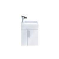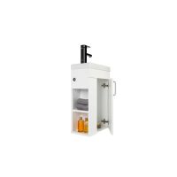 Тумба с умывальником для ванной комнаты, подвесная. Размеры тумбы без умывальника: 213х390х600 мм (ДхШхВ). Размеры умывальника: 220х400 мм (ДхШ). Фасад МДФ 16мм в эмали, боковины ЛДСП белый глянец. Одна распашная дверца, 2 открытые полки. Петли с доводчиком. Материал умывальника: фаянс, ширина: 40 см.