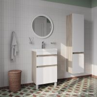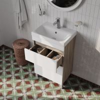 Компактная напольная тумба для ванной Zodiac с ящиками – удобство и практичность в сочетании с лаконичным скандинавским дизайном. • Корпус сделан из влагостойкой ЛДСП в уютном цвете «ясень-шимо», фасад – из влагостойкой ЛДСП, покрыт несколькими слоями белоснежной матовой эмали. Такое качественное исполнение обеспечит долгий срок службы мебели во влажном помещении ванной (при соблюдении рекомендаций по уходу). • Керамический умывальник с высоким бортом и большой вместительной чашей в комплекте. Удобен для гигиенических и хозяйственных нужд. • Два вместительных выдвижных ящика с механизмом плавного доведения закрываются плавно и бесшумно. Интегрированные ручки. Фурнитура рассчитана на 30 000 открываний, что составляет более 10 лет исправной работы. • В комплекте белые пластиковые ножки 100 мм и сифон, за счет чего тумба полностью готова к установке. Гарантия на мебель для ванной IDDIS® – 3 года. (с) Авторский текст, апрель 2023 г.