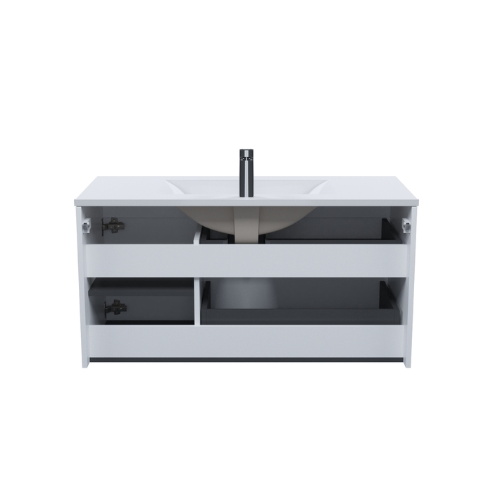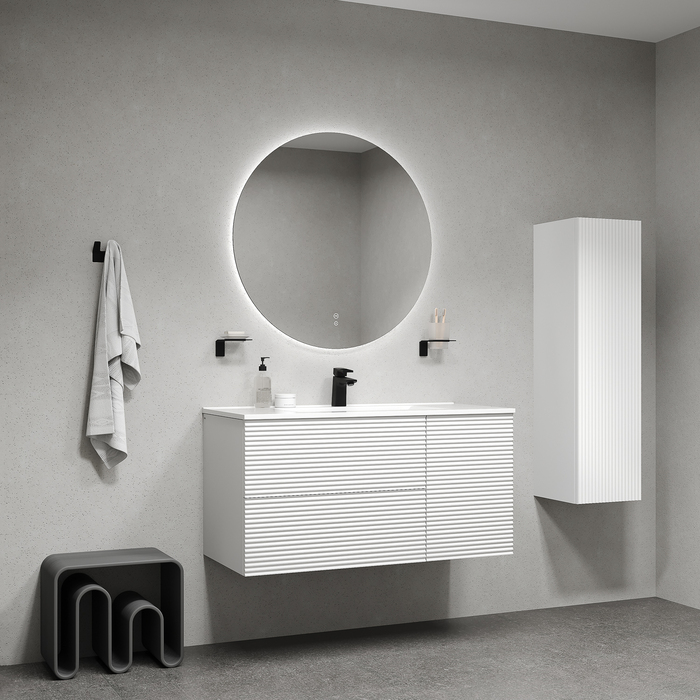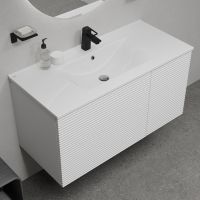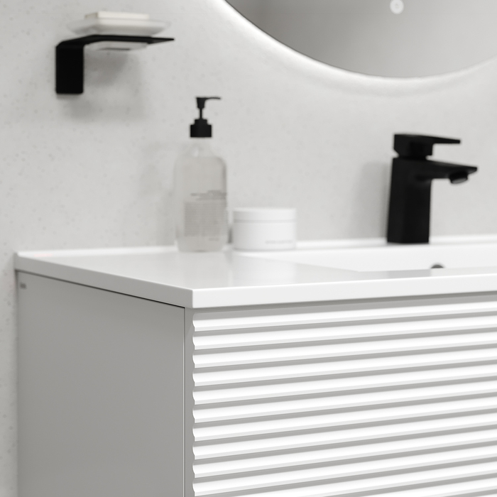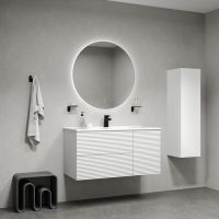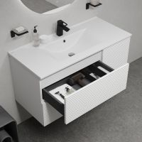 Вместительная подвесная тумба для ванной комнаты Bild с умывальником и выдвижными ящиками и полками – красивый дизайн с трендовой горизонтальной фрезеровкой в сочетании с универсальным белым цветом, удобством и практичностью. Материал фасадов – МДФ с покрытием ПВХ-пленкой. Она разработана для использования в помещениях с высокой влажностью и сохранит первоначальный вид мебели надолго (при должном уходе). Материал боковин – МДФ. Керамический умывальник с высоким бортом и большой вместительной чашей в комплекте. Удобен для гигиенических и хозяйственных нужд. Два ящика с направляющими скрытого монтажа с доводчиком Hettich и полки с распашной дверкой. Фурнитура рассчитана на более 10 лет исправной работы. Современный механизм открытия Push-to-Open – открывается нажатием на фасад. В комплекте крепеж для монтажа тумбы. Сифон приобретается отдельно. Гарантия на мебель IDDIS® – 3 года, на умывальник – 5 лет. (с) Авторский текст, март 2025 г.