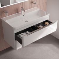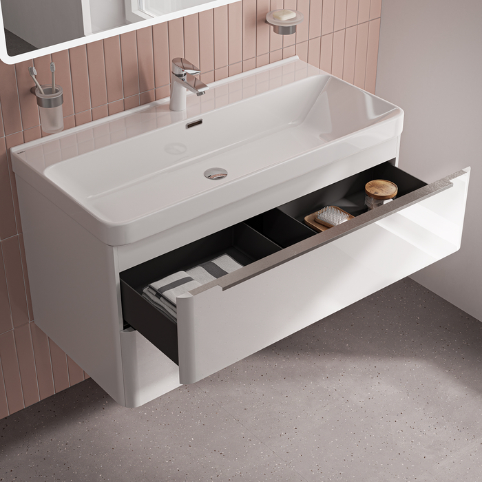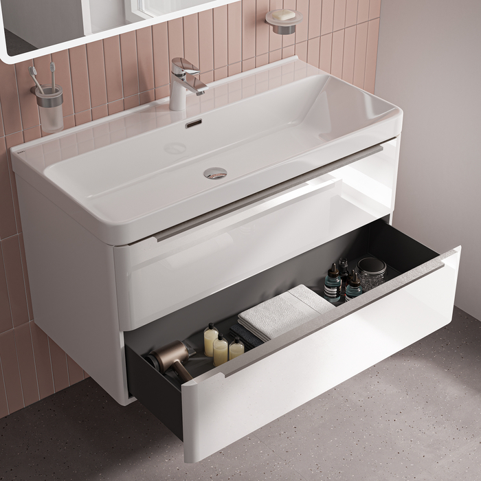 Вместительная подвесная тумба Cloud X с большим удобным умывальником и тонкими ручками – стильное решение для современной ванной и новое прочтение популярной серии Cloud. • Материал фасадов и боковин – МДФ с глянцевой эмалью. Такое качественное исполнение обеспечит долгий срок службы мебели во влажном помещении ванной (при соблюдении рекомендаций по уходу). • Тонкие ручки из анодированного алюминия с притупленными мягкими краями комфортны и безопасны даже для детей. • Керамический умывальник с глубокой и широкой чашей в комплекте удобен для гигиенических и хозяйственных нужд. Санитарная керамика не задерживает загрязнения и неприятные запахи, надолго сохраняя первозданную белизну. В комплекте 3 декоративных кольца перелива (чёрный матовый, белый матовый, глянцевый хром). • Два выдвижных ящика с увеличенным объёмом хранения закрываются плавно и бесшумно благодаря высококачественным скрытым направляющим с доводчиками. • Ящики полностью выдвигаются, что делает их практичными и удобными в использовании. • Тонкие боковины внутренних ящиков из водостойкого PVC выглядят эстетично и делают их более лёгкими. • Фурнитура мебели IDDIS® рассчитана на 30 000 открываний, что составляет более 10 лет исправной работы. • Усиленные навесы тумбы выдерживают до 130 кг нагрузки. Сифон приобретается отдельно. Подходят сифоны IDDIS® арт. 900BVG0010VD, 902BV750VD, 900B000010VD (выпуск приобретается отдельно). Гарантия на мебель IDDIS® – 3 года, на умывальник – 25 лет. (с) Авторский текст, январь 2026 г.