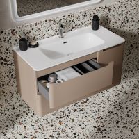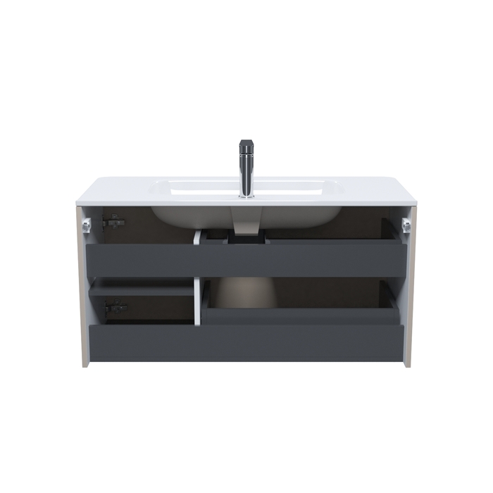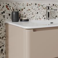Вместительная подвесная тумба с плоским умывальником Edifice в теплом оттенке капучино – воплощение современного минимализма. Мягкие линии корпуса в сочетании с удобными интегрированными ручками выглядят свежо и актуально. Смотрится аккуратно, легко и не усложняет процесс уборки в ванной благодаря подвесной конструкции. • В комплекте умывальник (арт. 0101000i28) из качественного фарфора. Он отличается высокой прочностью и прост в уходе: не задерживает загрязнения и неприятные запахи, надолго сохраняя первозданную белизну. • Два выдвижных ящика закрываются плавно и бесшумно благодаря высококачественным скрытым направляющим с доводчиками немецкого производства. • Надежные крепления рассчитаны на большой вес и позволяют равномерно распределять нагрузку. • Фурнитура рассчитана на 30 000 открываний, что составляет более 10 лет исправной работы. Гарантия на мебель IDDIS® – 3 года. (с) Авторский текст, август 2023 г.