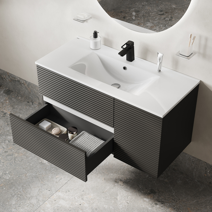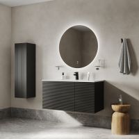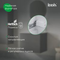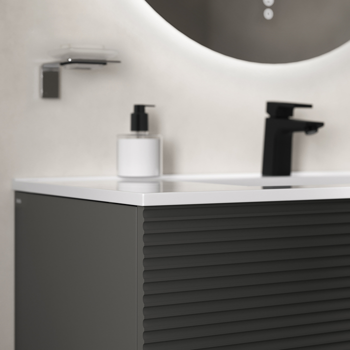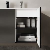 Вместительная подвесная тумба для ванной комнаты Bild с умывальником и выдвижными ящиками и полками – красивый дизайн с трендовой горизонтальной фрезеровкой в сочетании с популярным темно-серым цветом, удобством и практичностью. Материал фасадов – МДФ с покрытием ПВХ-пленкой. Она разработана для использования в помещениях с высокой влажностью и сохранит первоначальный вид мебели надолго (при должном уходе). Материал боковин – МДФ. Керамический умывальник с высоким бортом и большой вместительной чашей в комплекте. Удобен для гигиенических и хозяйственных нужд. Два ящика с направляющими скрытого монтажа с доводчиком Hettich и полки с распашной дверкой. Фурнитура рассчитана на более 10 лет исправной работы. Современный механизм открытия Push-to-Open – открывается нажатием на фасад. В комплекте крепеж для монтажа тумбы. Сифон приобретается отдельно. Гарантия на мебель IDDIS® – 3 года, на умывальник – 5 лет. (с) Авторский текст, март 2025 г.