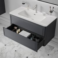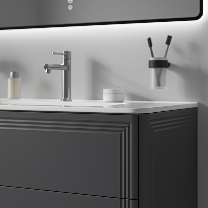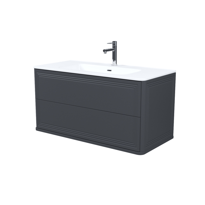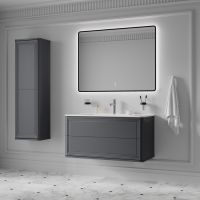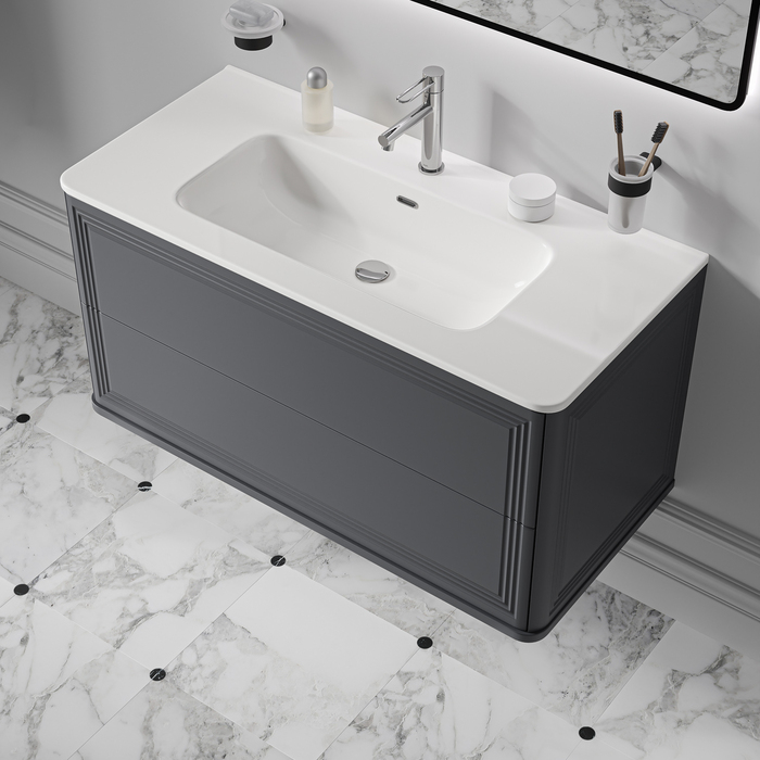 Вместительная подвесная тумба Oxford Neo с умывальником и выдвижными ящиками в элегантном стиле нео-классика с изящной фрезеровкой на фасадах и торцах. Идеально дополнит современные и классические интерьеры и станет настоящим украшением ванной. При желании тумбу можно сделать напольной – ножки высотой 30 см продаются отдельно в трёх цветах (белый, чёрный и светлый бук). Материал фасадов и боковин – МДФ с покрытием тёмно-серой матовой эмалью (RAL7015). Продумано для использования в помещениях с высокой влажностью и сохранит первоначальный вид мебели надолго (при должном уходе). Керамический умывальник с высоким бортом и большой вместительной чашей в комплекте. Удобен для гигиенических и хозяйственных нужд. Два ящика с шариковыми направляющими скрытого монтажа Hettich. Фурнитура рассчитана на 30 000 открываний – это более 10 лет исправной работы. Современный механизм открытия Push-to-Open – ящики открываются нажатием на фасад. В комплекте регулируемые навесы Hettich для удобного монтажа тумбы. Сифон приобретается отдельно. Гарантия на мебель IDDIS® – 3 года, на умывальник – 5 лет. (с) Авторский текст, август 2025 г.