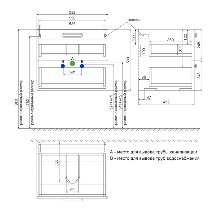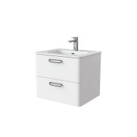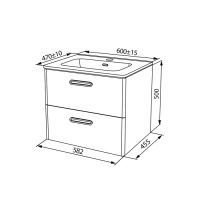 Тумба с умывальником для ванной комнаты, подвесная. Размеры тумбы без умывальника: 470х613х163 мм (ДхШхВ). Размеры умывальника: 460х600 мм (ДхШ). Фасад МДФ 19 мм в эмали (белый глянец). Корпус влагостойкий ЛДСП 16 мм в эмали. Ручки - цвет состаренное олово. Два выдвижных ящика с механизмом плавного доведения. Пластиковый ограничитель под сифон в верхнем ящике. Перекатной организатор в нижнем ящике. Навесы усиленные с планкой. Упаковка: картон, пленка, пенопластовые уголки.