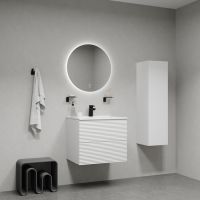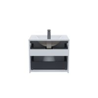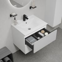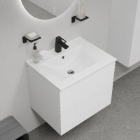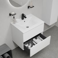 Компактная подвесная тумба для ванной комнаты Bild с умывальником и выдвижными ящиками – красивый дизайн с трендовой горизонтальной фрезеровкой в сочетании с универсальным белым цветом, удобством и практичностью. • Материал фасадов – МДФ с покрытием ПВХ-пленкой. Она разработана для использования в помещениях с высокой влажностью и сохранит первоначальный вид мебели надолго (при должном уходе). Материал боковин – МДФ. • Керамический умывальник с высоким бортом и большой вместительной чашей в комплекте. Удобен для гигиенических и хозяйственных нужд. • Два ящика с направляющими скрытого монтажа с доводчиком Hettich. Фурнитура рассчитана на более 10 лет исправной работы. • Современный механизм открытия Push-to-Open – открывается нажатием на фасад. • В комплекте крепеж для монтажа тумбы. • Сифон приобретается отдельно. Гарантия на мебель IDDIS® – 3 года, на умывальник – 5 лет. (с) Авторский текст, октябрь 2024 г.