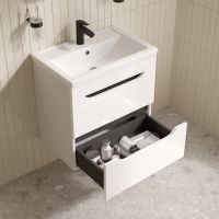 Компактная подвесная тумба для ванной Ray с умывальником и выдвижными ящиками – универсальная и практичная мебель, которая будет отлично смотреться в любом современном интерьере. Сочетание белого цвета, светло-серых элементов фасада и тёмно-серых ящиков создаёт стильный дизайн вне времени. У тумбы увеличенная высота, что делает её более вместительной и удобной. Материал фасадов – МДФ 16 мм, максимально устойчивый к влаге. Детали из МДФ полностью окрашены водостойкой глянцевой эмалью Сarpoly в 6 слоёв внутри и снаружи, что обеспечивает долговечное и износостойкое покрытие сроком службы более 15 лет во влажном помещении ванной (при соблюдении рекомендаций по уходу). Керамический умывальник с большой глубокой чашей – практично для гигиенических и хозяйственных нужд. Готовое отверстие под смеситель D=34 мм. Пластиковая защита сифона внутри ящиков увеличивает долговечность и влагостойкость тумбы. Лаконичные интегрированные ручки для комфортного хвата рукой с прокрашенным фрезерованным контуром – удобны в эксплуатации и более долговечны, чем классические мебельные ручки. Выдвижные ящики открываются захватом за фасад и благодаря механизму плавного доведения закрываются плавно и бесшумно. Фурнитура рассчитана на 30 000 открываний, что составляет более 10 лет исправной работы. Ящики полностью выдвигаются, что делает их очень удобными в использовании. Гарантия на мебель IDDIS® – 3 года, на умывальник – 25 лет. (с) Авторский текст, сентябрь 2025 г.