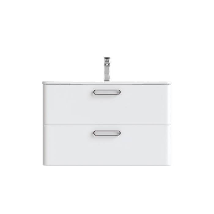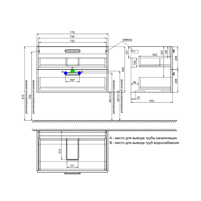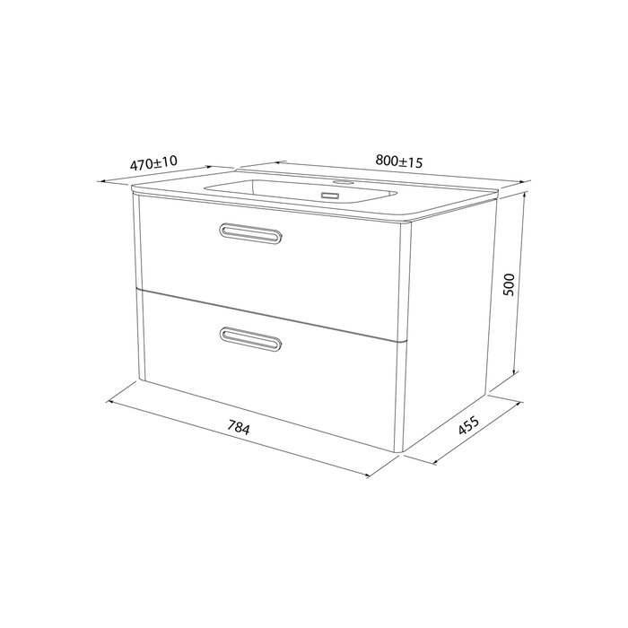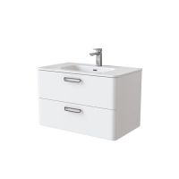 Тумба с умывальником для ванной комнаты, подвесная. Размеры тумбы без умывальника: 463х792х500 мм (ДхШхВ). Размеры умывальника: 460х800 мм (ДхШ). Фасад МДФ 19 мм в эмали (белый глянец). Корпус влагостойкий ЛДСП 16 мм в эмали. Ручки - цвет состаренное олово. Два выдвижных ящика с механизмом плавного доведения. Пластиковый ограничитель под сифон в верхнем ящике. Перекатной организатор в нижнем ящике. Навесы усиленные с планкой. Упаковка: картон, пленка, пенопластовые уголки.