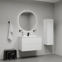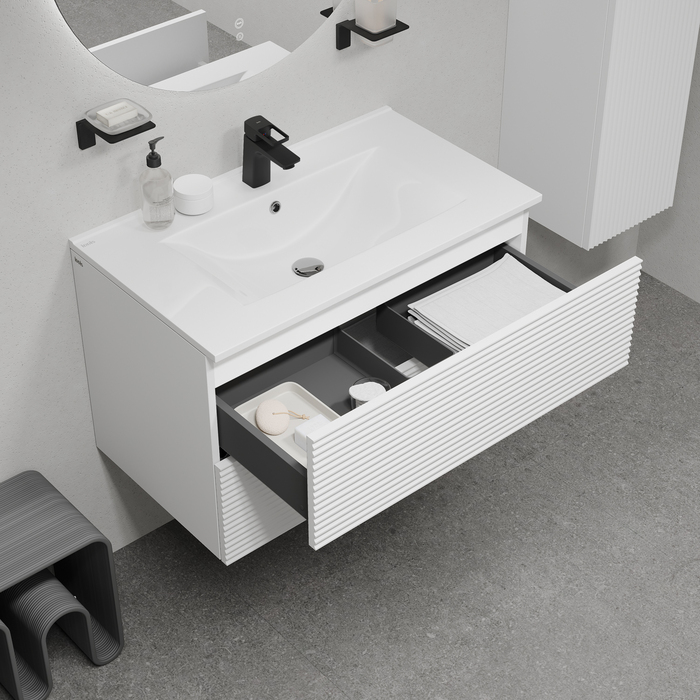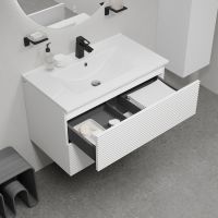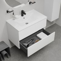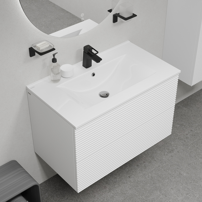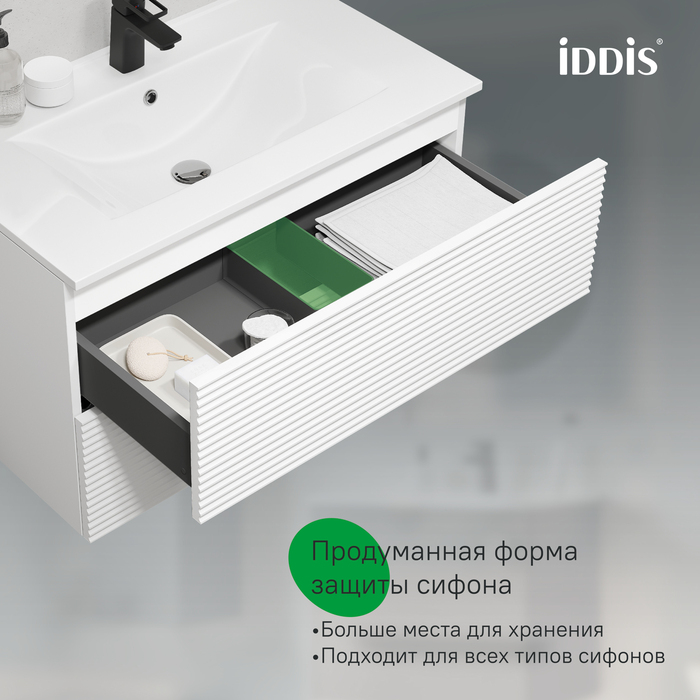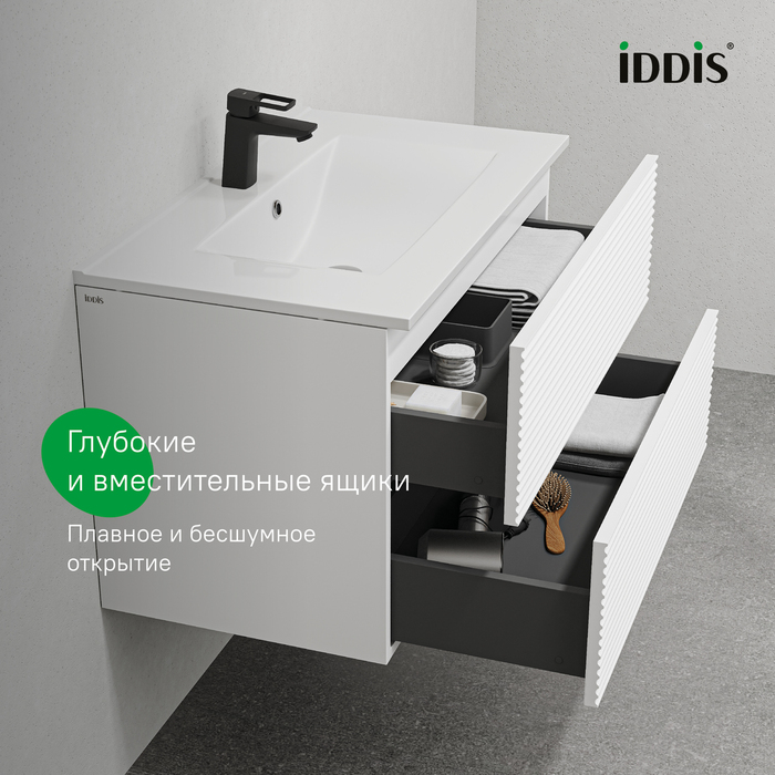 Вместительная подвесная тумба для ванной комнаты Bild с умывальником и выдвижными ящиками – красивый дизайн с трендовой горизонтальной фрезеровкой в сочетании с универсальным белым цветом, удобством и практичностью. • Материал фасадов – МДФ с покрытием ПВХ-пленкой. Она разработана для использования в помещениях с высокой влажностью и сохранит первоначальный вид мебели надолго (при должном уходе). Материал боковин – МДФ. • Керамический умывальник с высоким бортом и большой вместительной чашей в комплекте. Удобен для гигиенических и хозяйственных нужд. • Два ящика с направляющими скрытого монтажа с доводчиком Hettich. Фурнитура рассчитана на более 10 лет исправной работы. • Современный механизм открытия Push-to-Open – открывается нажатием на фасад. • В комплекте крепеж для монтажа тумбы. • Сифон приобретается отдельно. Гарантия на мебель IDDIS® – 3 года, на умывальник – 5 лет. (с) Авторский текст, октябрь 2024 г.