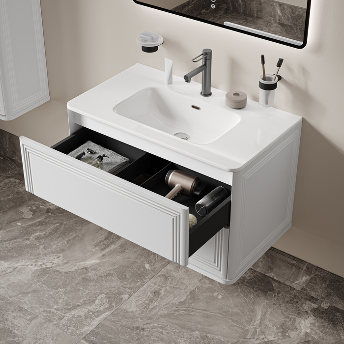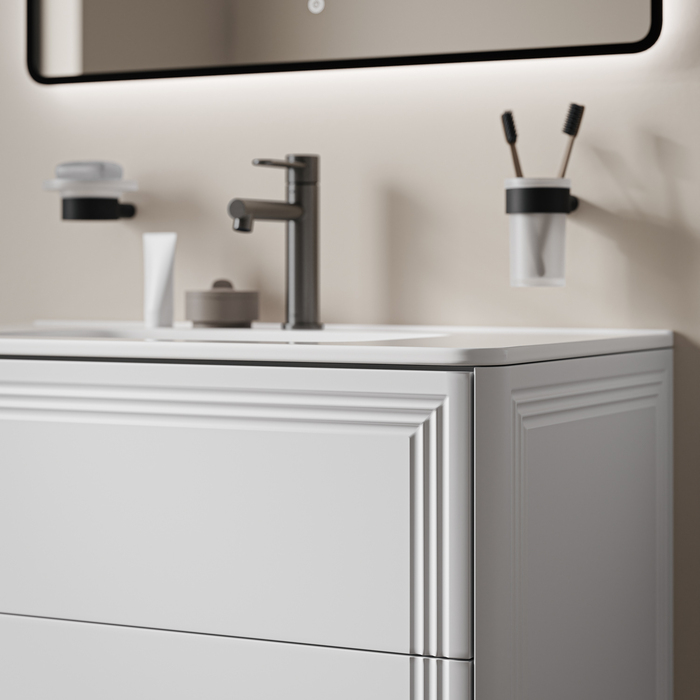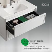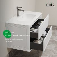 Вместительная подвесная тумба Oxford Neo с умывальником и выдвижными ящиками в элегантном стиле нео-классика с изящной фрезеровкой на фасадах и торцах. Идеально дополнит современные и классические интерьеры и станет настоящим украшением ванной. При желании тумбу можно сделать напольной – ножки высотой 30 см продаются отдельно в трёх цветах (белый, чёрный и светлый бук). Материал фасадов и боковин – МДФ с покрытием белой матовой эмалью. Продумано для использования в помещениях с высокой влажностью и сохранит первоначальный вид мебели надолго (при должном уходе). Керамический умывальник с высоким бортом и большой вместительной чашей в комплекте. Удобен для гигиенических и хозяйственных нужд. Два ящика с шариковыми направляющими скрытого монтажа Hettich. Фурнитура рассчитана на 30 000 открываний – это более 10 лет исправной работы. Современный механизм открытия Push-to-Open – ящики открываются нажатием на фасад. В комплекте регулируемые навесы Hettich для удобного монтажа тумбы. Сифон приобретается отдельно. Гарантия на мебель IDDIS® – 3 года, на умывальник – 5 лет. (с) Авторский текст, август 2025 г.