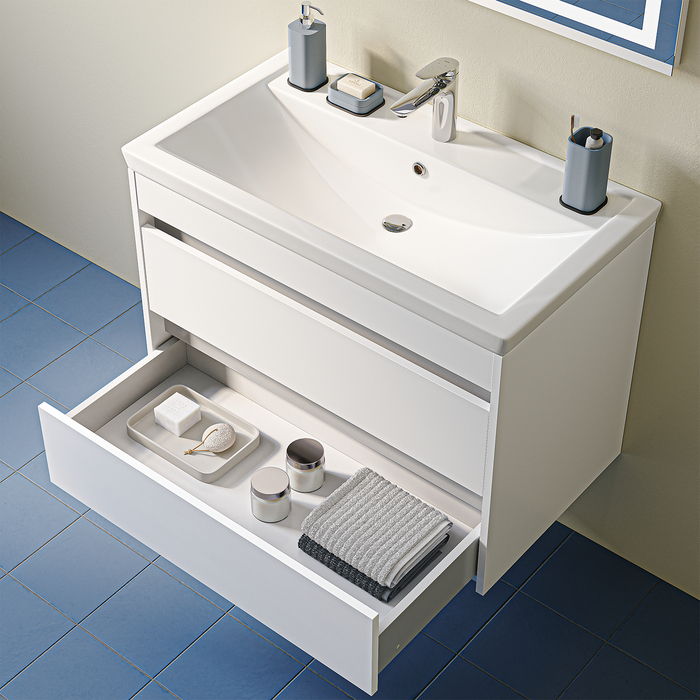 Вместительная подвесная тумба для ванной Zodiac X с умывальником и двумя выдвижными ящиками – новая версия коллекции-бестселлера Zodiac, которую мы обновили согласно актуальным требованиям дизайна и функционала. Универсальный стиль идеально впишется в любой интерьер. Материал фасада – МДФ с покрытием ПВХ-плёнкой, материал боковин – влагостойкий ЛДСП. Такое качественное исполнение обеспечит долгий срок службы мебели во влажном помещении ванной (при соблюдении рекомендаций по уходу). Обновлённый керамический умывальник увеличенных габаритов с большой и глубокой чашей. Удобен для гигиенических и хозяйственных нужд. Ящики открываются захватом за фасад и благодаря механизму плавного доведения закрываются плавно и бесшумно. Фурнитура рассчитана на 30 000 открываний, что составляет более 10 лет исправной работы. Ящики полностью выдвигаются, что делает их очень удобными в использовании. Гарантия на мебель IDDIS® – 3 года, на умывальник – 25 лет. (с) Авторский текст, май 2025 г.