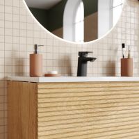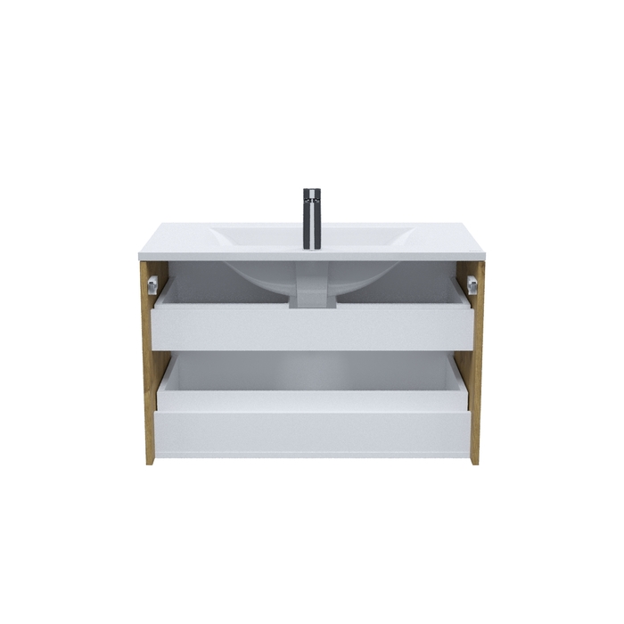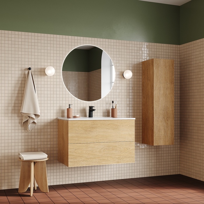 Вместительная подвесная тумба для ванной комнаты Bild с умывальником и ящиками – красивый дизайн со структурной горизонтальной фрезеровкой в сочетании с теплым оттенком дуба, удобством и практичностью. - Материал фасада – МДФ с покрытием ПВХ-пленкой. Она разработана для использования в помещениях с высокой влажностью и сохранит первоначальный вид мебели надолго (при должном уходе). Материал боковин – ЛДСП. - Керамический умывальник с высоким бортом и большой вместительной чашей в комплекте. Удобен для гигиенических и хозяйственных нужд. - Два ящика с направляющими скрытого монтажа с доводчиком Hettich. Фурнитура рассчитана на 30 000 открываний – это более 10 лет исправной работы. - Современный механизм открытия Push-to-Open – открывается нажатием на фасад. - В комплекте крепеж для монтажа тумбы. - Сифон приобретается отдельно. Гарантия на мебель IDDIS® – 3 года, на умывальник – 5 лет. (с) Авторский текст, июнь 2024 г.