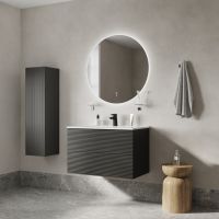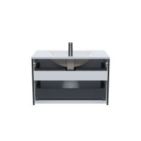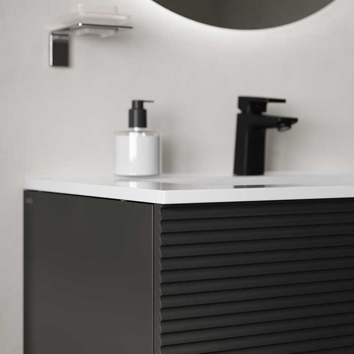 Вместительная подвесная тумба для ванной комнаты Bild с умывальником и выдвижными ящиками – красивый дизайн с трендовой горизонтальной фрезеровкой в сочетании с популярным темно-серым цветом, удобством и практичностью. • Материал фасадов – МДФ с покрытием ПВХ-пленкой. Она разработана для использования в помещениях с высокой влажностью и сохранит первоначальный вид мебели надолго (при должном уходе). Материал боковин – МДФ. • Керамический умывальник с высоким бортом и большой вместительной чашей в комплекте. Удобен для гигиенических и хозяйственных нужд. • Два ящика с направляющими скрытого монтажа с доводчиком Hettich. Фурнитура рассчитана на более 10 лет исправной работы. • Современный механизм открытия Push-to-Open – открывается нажатием на фасад. • В комплекте крепеж для монтажа тумбы. • Сифон приобретается отдельно. Гарантия на мебель IDDIS® – 3 года, на умывальник – 5 лет. (с) Авторский текст, октябрь 2024 г.