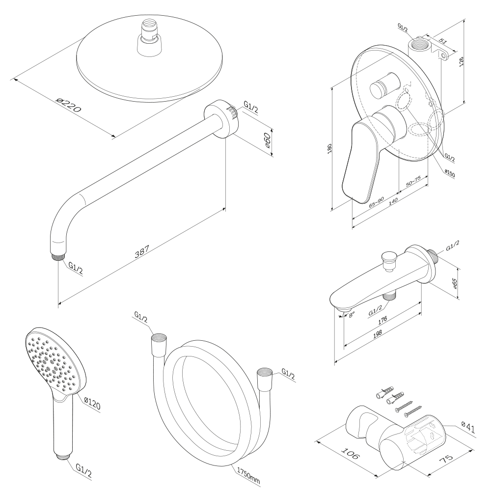 FB85A10020 X-Joy, набор: см-ль д/в/душа, верхний душ 220 мм, держатель д/верхн.душа, душ.набор (ручн