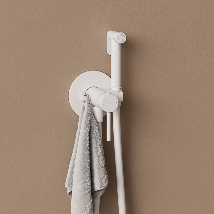 Встраиваемый смеситель с гигиеническим душем Axes в стильном матовом белом цвете – практичный и стильный, его дизайн сочетает в себе трендовый минимализм форм и округлые формы. Имеет крючок для полотенца, который можно установить как слева, так и справа, меняя местами с держателем для лейки. Душевой шланг с защитой от перекручивания в комплекте (длина 1,2 м). • Гигиеническая лейка очень компактная, но при этом она комфортно и уверенно ощущается в любой руке – благодаря тому, что изготовлена из увесистой латуни. Устойчива к коррозии, переносит перепады давления и температуры воды. Универсальна: можно использовать не только для личной гигиены, но и в качестве гидроерша для мытья унитаза. • Пластиковая проставка в держателе лейки защищает поверхность гайки шланга от царапин и крепко держит его в держателе. • Экономит пространство и упрощает уборку — благодаря скрытому монтажу в стену (на глубину 41–53 мм) и отсутствию больших выступающих элементов конструкции. Подключается с помощью любых труб, диаметр входных отверстий ½ дюйма. • Смеситель прослужит долго благодаря надёжному корпусу из прочной латуни, стойкому к коррозии, резким изменениям давления и перепадам температуры воды. • Плавный ход ручки и абсолютная точность регулировки температуры и напора воды — за счёт качественного керамического картриджа IDDIS®. Гарантия на смесители IDDIS® – 10 лет, на лейку и шланг – 3 года. (с) Авторский текст, январь 2026 г.