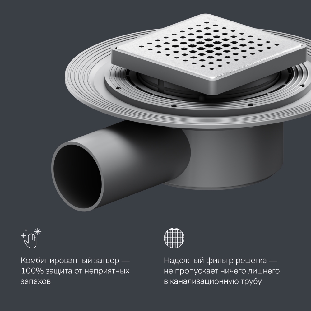 Соединение непревзойденного дизайна и функциональности в трапе для душа MasterFlow Point квадратной формы. Ультрамодная дизайнерская решетка подойдет для любых интерьеров ванных комнат. Трап будет любимой органичной деталью дополняющей ваш душ. Обладает надежным комбинированным затвором. Максимальное предотвращение проникновения запахов из канализации. Широкий фланец трапа позволяет надежно установить и закрепить изделие в напольной поверхности что помогает предотвратить риск протечек и повреждений изделия. Продукт обладает возможностью регулировки высоты монтажа что предполагает экономию бюджета при заливке пола. Выход изделия на 50 мм. Размер трапа 10 см. Дизайн продукта выполнен в матовом стальном цвете.