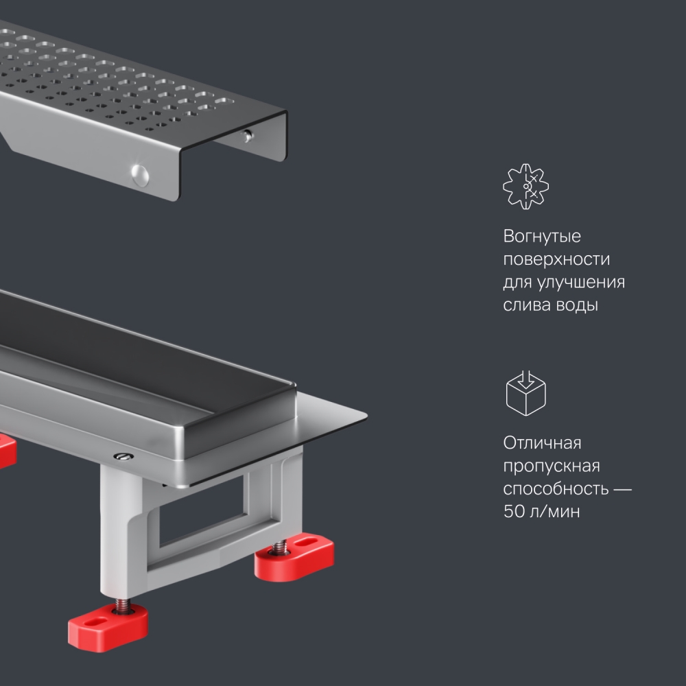 Непревзойденный ультрамодный дизайн решетки трапа детально проработанная форма изделия точные выверенные линии. Представляем инновационный трап для душа Masterflow. Трап для душа имеет высокую пропускную способность 50 л/мин. Обладает комбинированным затвором: сухим магнитным и гидрозатвором. Проверенная технология гарантирует 100% защиту от проникновения запахов из канализации высокую надежность и долговечность. Выдерживает даже самые большие механические нагрузки. Поворотный сифон на 360 градусов позволяет установить трап наиболее удобным и комфортным образом. Продукт обладает низкой высотой монтажа и возможностью регулировки что предполагает экономию бюджета при заливке пола. Нержавеющая сталь со специальным антикоррозийным защитным покрытием нанесенная методом кислотной пассивации. Выход разработан на два диаметра: 40 и 50 мм которые выбираются в процессе монтажа. Размер изделия 60 см. Дизайн трапа выполнен в матовом стальном цвете.