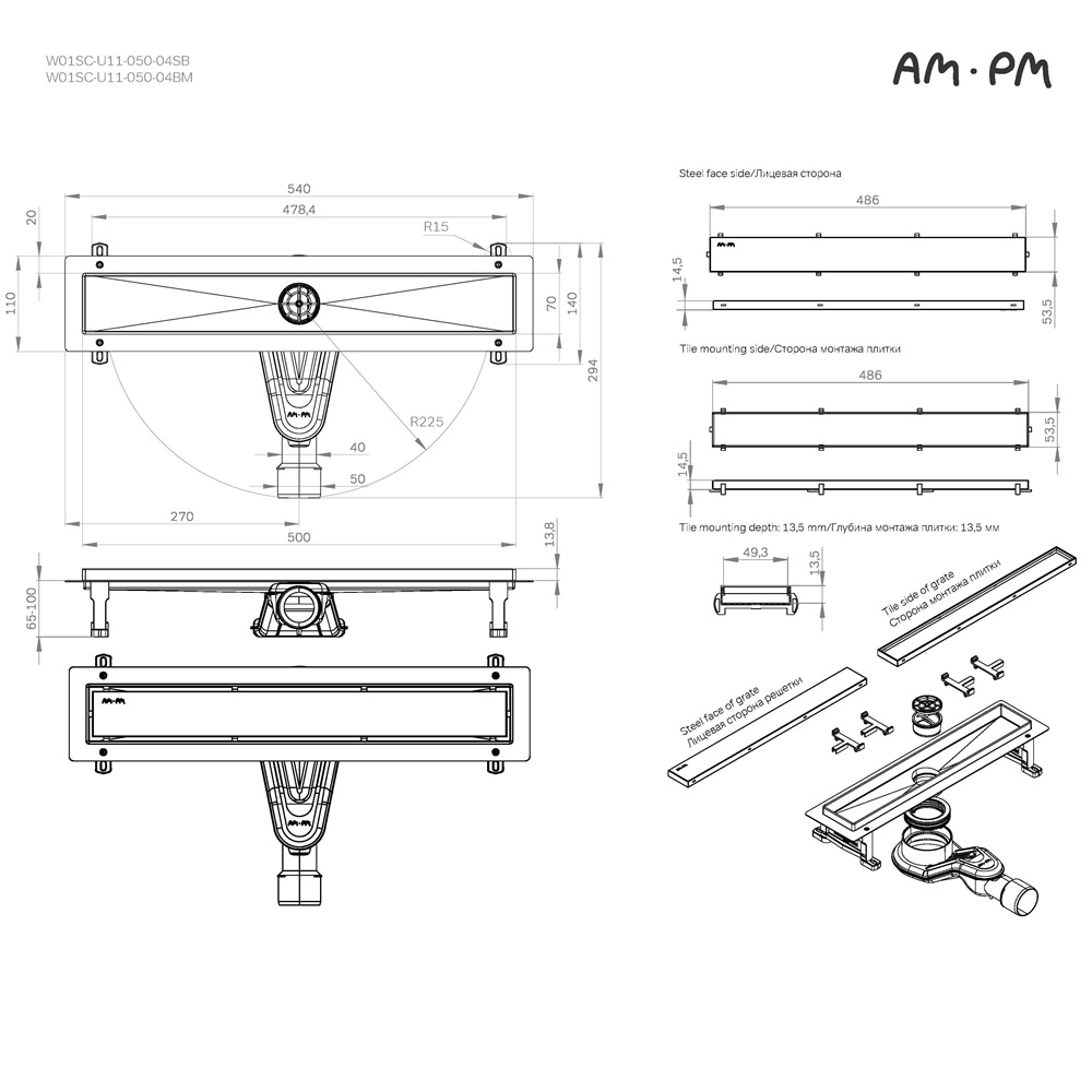 W01SC-U11-050-04BM MasterFlow Трап AM.PM для душа линейный универс затвор Tile 50см цвет черн мат