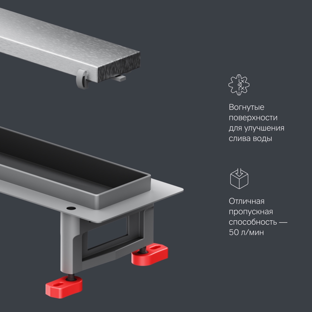 Детально проработанная форма изделия точные выверенные линии. Представляем инновационный трап для душа Masterflow. Универсальная двухсторонняя решетка трапа может быть использована как самостоятельная декоративная вставка либо как база для вклейки плитки. Трап для душа имеет высокую пропускную способность 50 л/мин. Обладает комбинированным затвором: сухим магнитным и гидрозатвором. Проверенная технология гарантирует 100% защиту от проникновения запахов из канализации высокую надежность и долговечность. Выдерживает даже самые большие механические нагрузки. Поворотный сифон на 360 градусов позволяет установить трап наиболее удобным и комфортным образом. Продукт обладает низкой высотой монтажа и возможностью регулировки что предполагает экономию бюджета при заливке пола. Нержавеющая сталь со специальным антикоррозийным защитным покрытием нанесенная методом кислотной пассивации. Выход разработан на два диаметра: 40 и 50 мм которые выбираются в процессе монтажа. Размер изделия 50 см. Дизайн трапа выполнен в матовом стальном цвете.