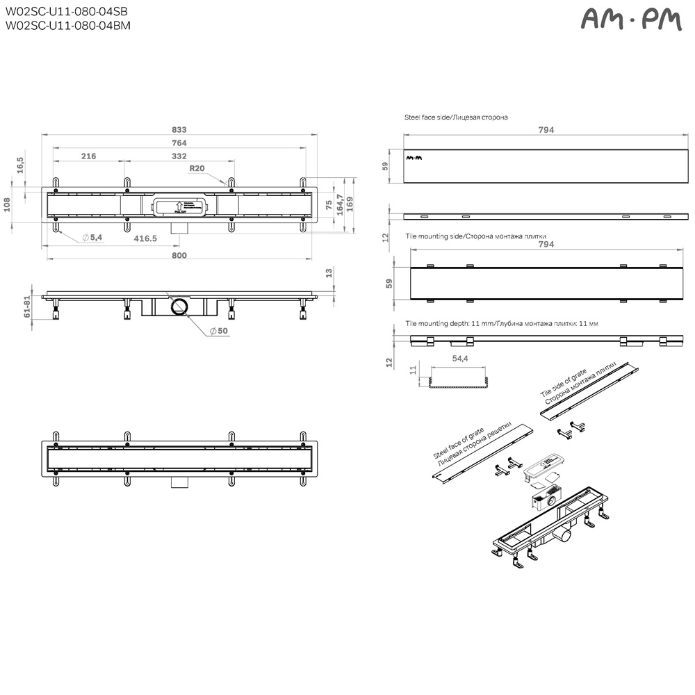 W02SC-U11-080-04SB PrimeFlow Трап AM.PM для душа линейный универс затвор Tile 80см цвет сталь мат