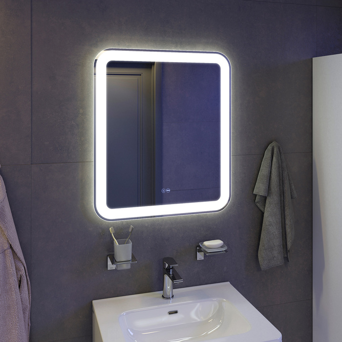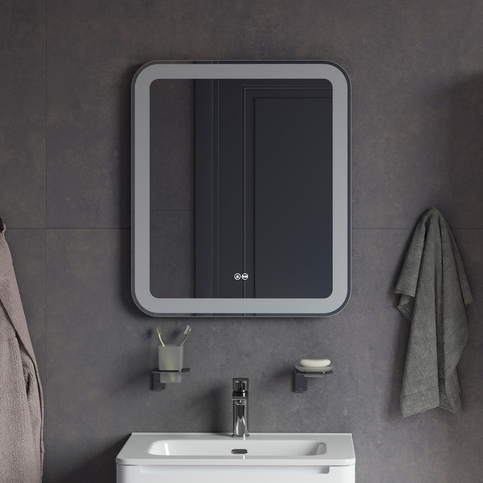 Зеркало для ванной с LED-подсветкой. Размеры: 700х600х32 мм. Пластиковый корпус. Термообогрев, сенсорный выключатель. Упаковка: картон, пленка, пенопластовые уголки.