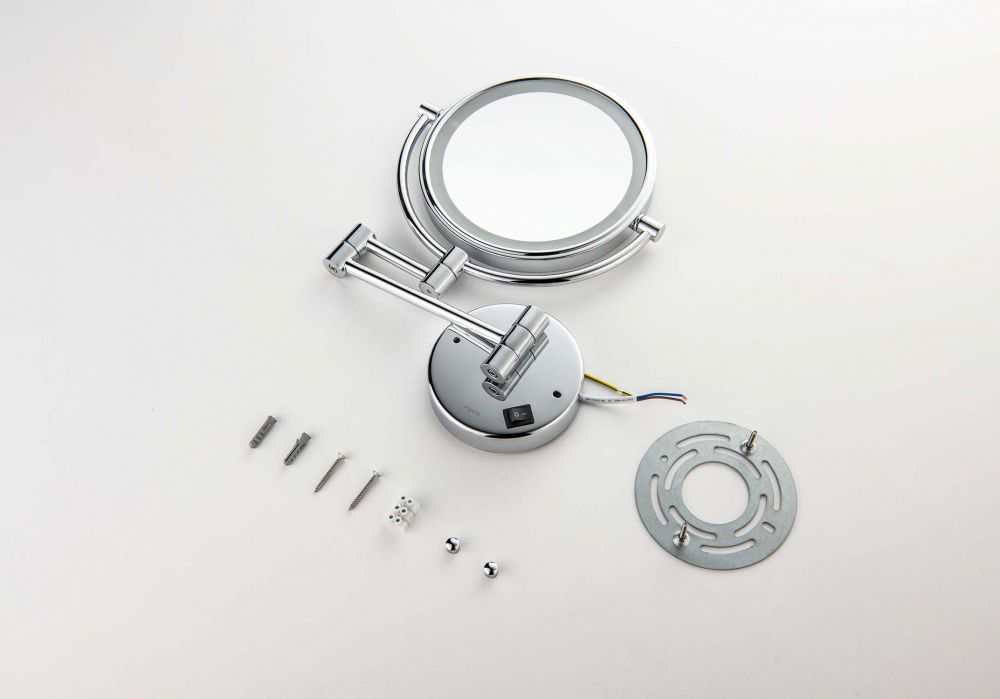 Материал - латунь Подсветка, белый свет первая сторона - увеличение 5х вторая сторона - обычное зеркало Упаковано в белую коробку Размеры: 257*257*314мм