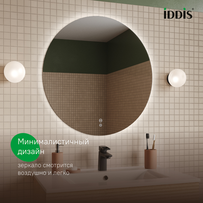 Стильное круглое зеркало Bild диаметром 70 см со встроенной LED-подсветкой и системой антизапотевания. Не имеет рамы, за счёт чего смотрится воздушно и легко, и благодаря универсальному дизайну украсит интерьер любой ванной. Ореольная светодиодная подсветка обеспечивает мягкий фронтальный свет, цвет освещения – холодный. Функция термообогрева предотвращает появление конденсата – нет необходимости протирать зеркало после принятия душа. Сенсорное управление подсветкой, подогревом и диммером с помощью касания. Надежный корпус защищает блок управления от влаги и обеспечивает долгий срок службы. Диодная лента интерьерной подсветки также защищена от влаги. Гарантия на зеркало IDDIS® – 3 года. (с) Авторский текст, май 2025 г.