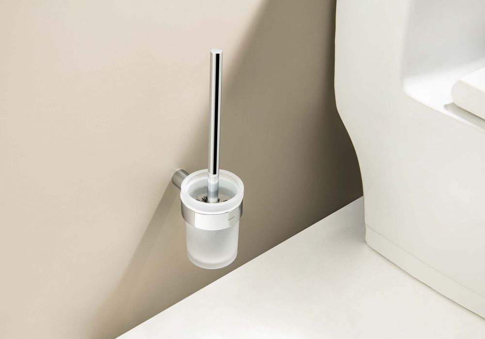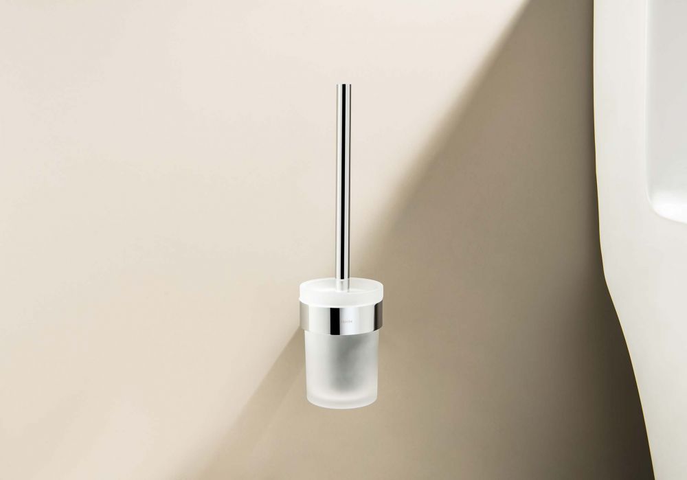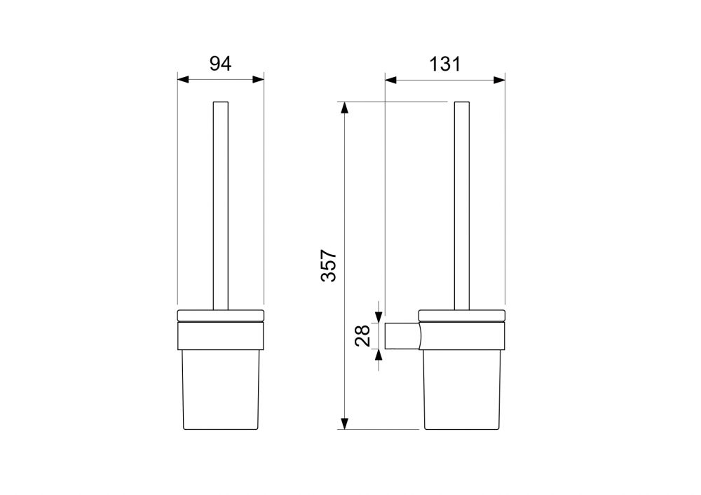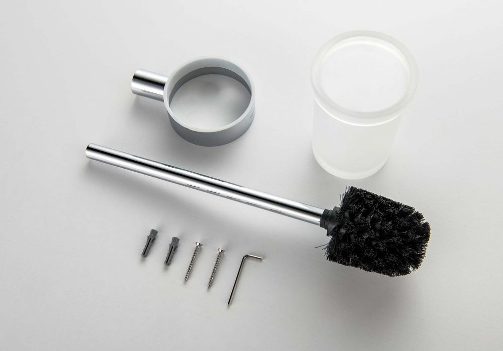 Материал - нержавейка Стакан из матового стекла Головка ершика из пластика, цвет черный Держатель из латуни Упаковано в белую коробку Размер: 94*130*374мм