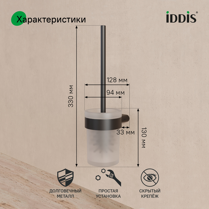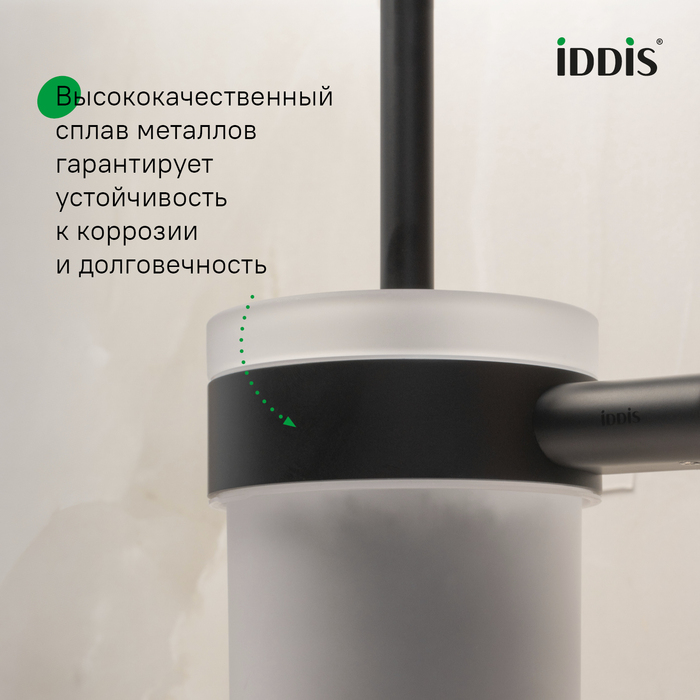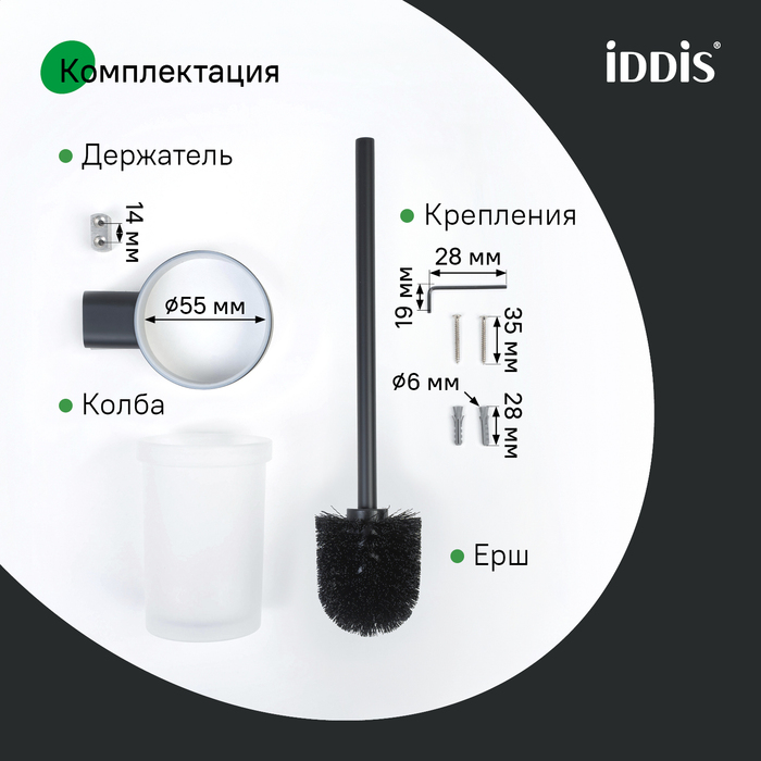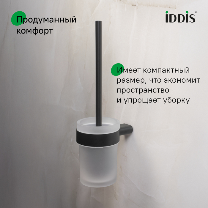 Стильный подвесной ёрш Petite в чёрном матовом цвете с колбой из матового белого стекла. Petite – базовая коллекция функциональных аксессуаров для ванной с минималистичным, спокойным дизайном и округлыми формами, что делает её универсальным украшением любого современного санузла. Аксессуары в универсальном матовом хроме преобразят интерьер, сделают его завершённым и гармоничным. Идеально дополнят смесители IDDIS® из коллекций Aiger по цвету и форме. Имеет компактный размер, что экономит пространство и упрощает уборку. Щётка идеального размера для удобной уборки не царапает унитаз. Износостойкая, устойчива к агрессивным средствам. Основной материал – нержавеющая сталь, что позволяет эксплуатировать аксессуары во влажном помещении ванной и даже в жёсткой воде на протяжении длительного времени. Повышенная стойкость к бытовой химии и механическим повреждениям благодаря надёжному PVD-покрытию. Уплотнительная прокладка надёжно фиксирует колбу в держателе и предотвращает её повреждение. Ёрш удобен в установке, монтаж не требует профессиональных навыков. Крепёжные элементы скрыты корпусом, что обеспечивает привлекательный и аккуратный внешний вид. Гарантия на аксессуары для ванной IDDIS® – 5 лет. (с) Авторский текст, октябрь 2025 г.
